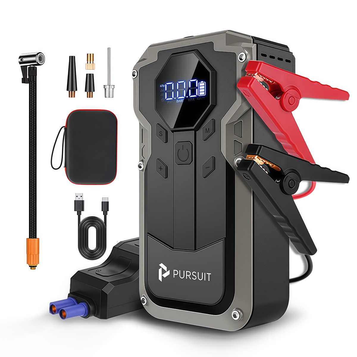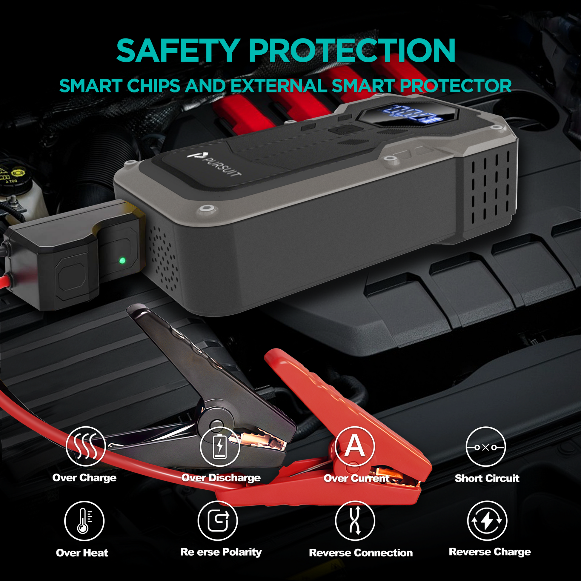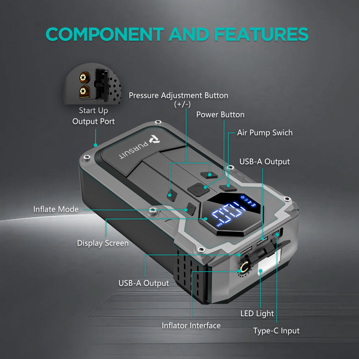 - ENHANCED SAFETY & QUALITY: The Pursuit Jump Starter with air compressor has 10 built-in 10 protection features that prevent misoperation from occurring, meeting national standard UL & FCC Certifications. Its durable ABS housing is tough enough to withstand accidental drops. Our customer's safety and comfortability using this product is our top priority
