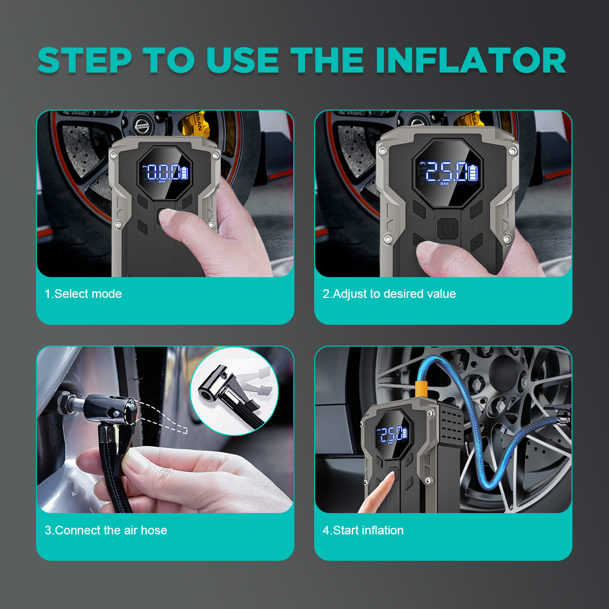 - PORTABLE AIR COMPRESSOR & TIRE INFLATOR: This 150PSI air compressor has 4 preset modes (3 units: PSI, kPa, Bar) to inflate cars, motorcycles, bikes, and balls. It automatically stops at your preset value—no need for constant adjustments or monitoring. The air pump’s high-quality cylinder delivers 25L/Min fast inflation, filling a tire from 32PSI to 36PSI in just one minute. Note: Allow the air compressor to rest for at least 10 minutes after 10 minutes of continuous operation