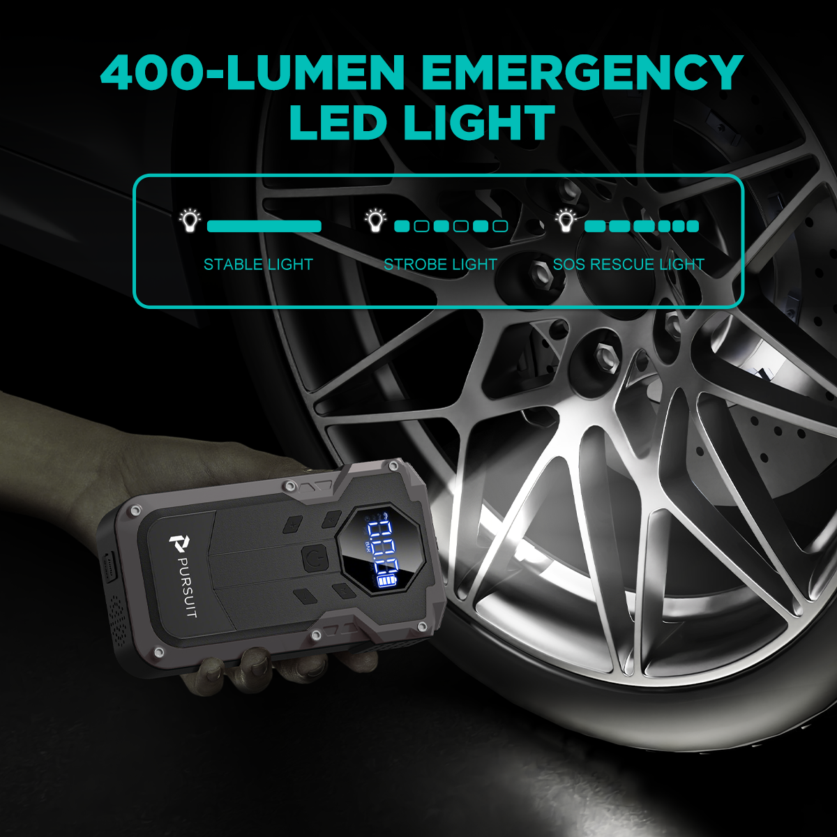 - ALL-IN-ONE PORTABLE JUMP STARTER:Say goodbye to old, bulky jump-start battery packs! The Pursuit Jump Starter with air compressor is more lightweight and portable with 6 practical functions to meet all your needs, including car emergency jumpstarting, air compressor, 3 light modes (flashlight, SOS warning, strobe), and a power bank (USB ports for charging mobile devices)