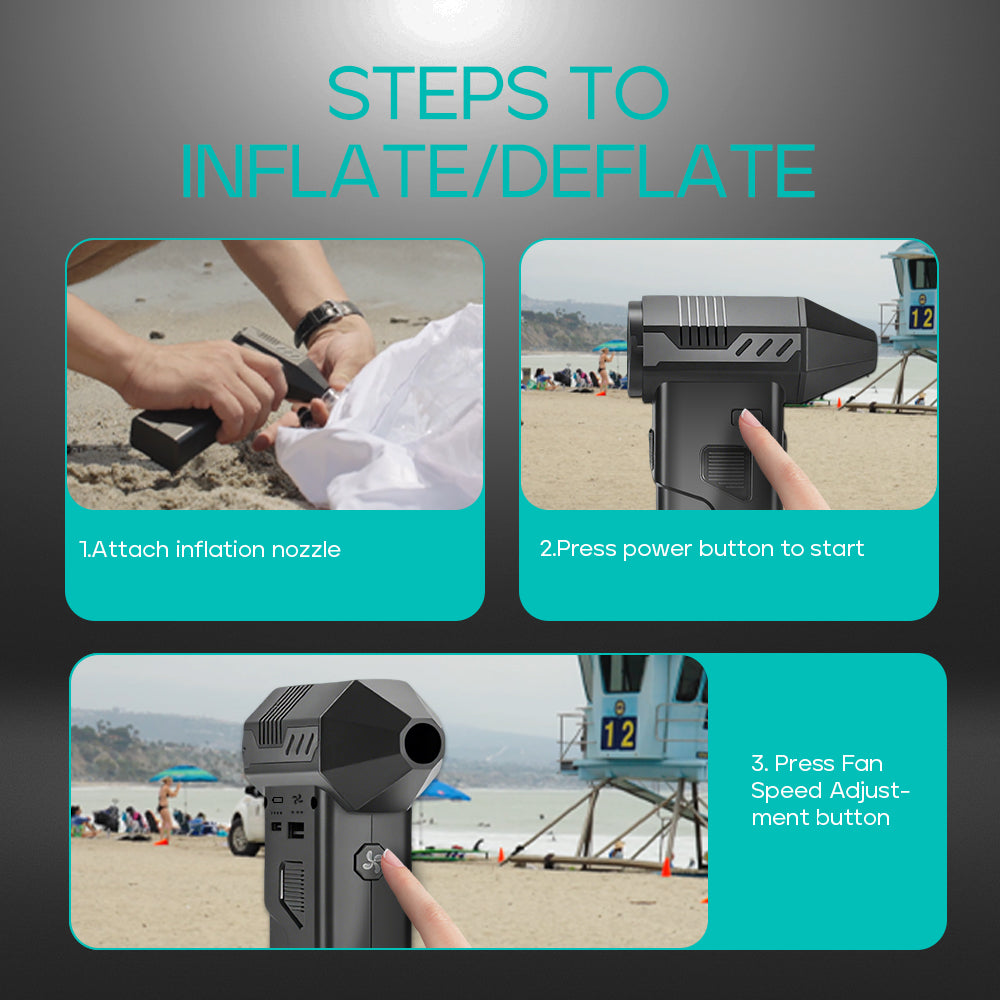 With Mate51, inflating or deflating is effortless. Simply attach the correct nozzle to the air port, press the Power Button to start, and use the Fan Speed Adjustment button to control airflow. Perfect for tires, sports gear, and inflatables anytime, anywhere.