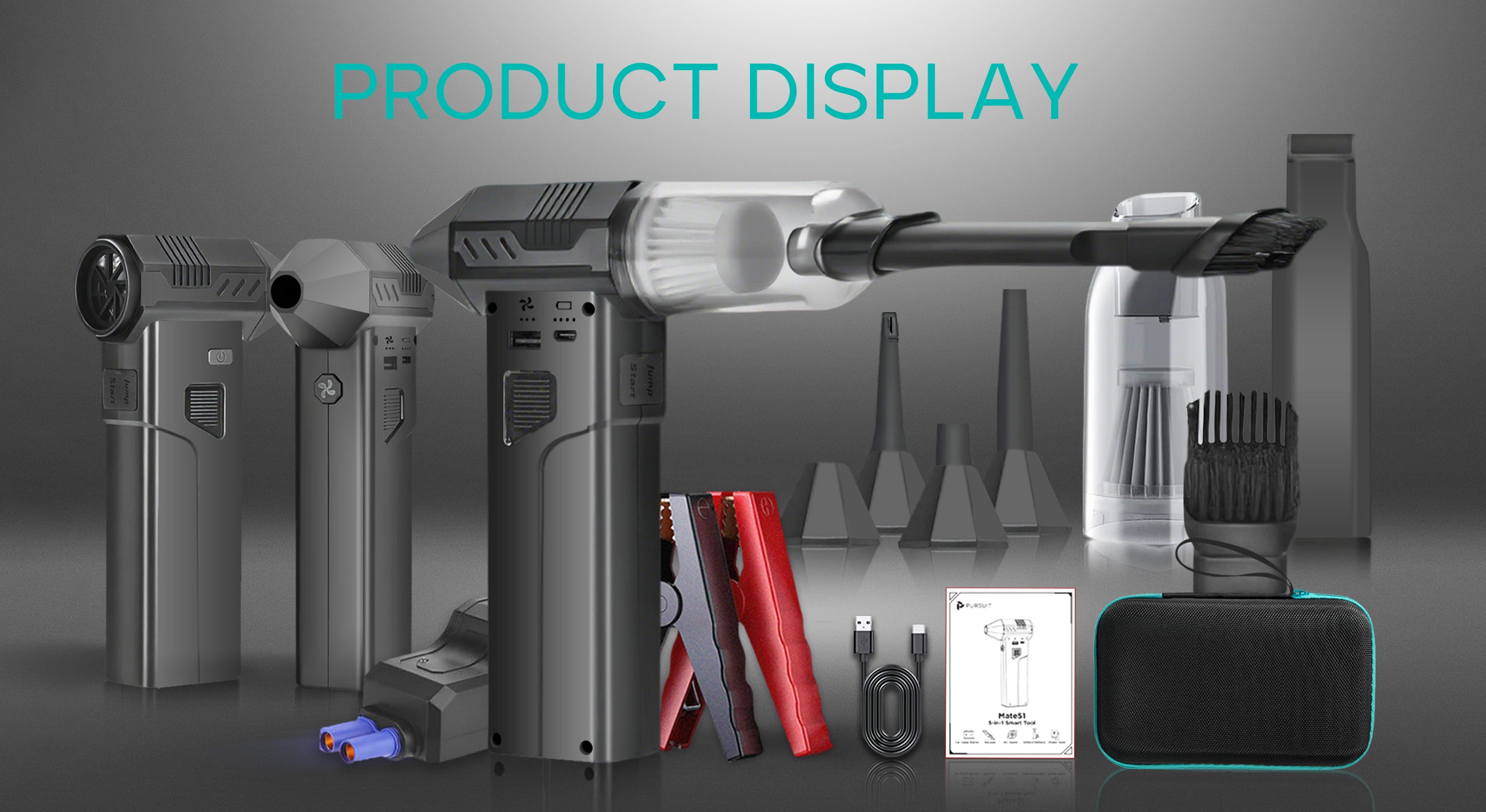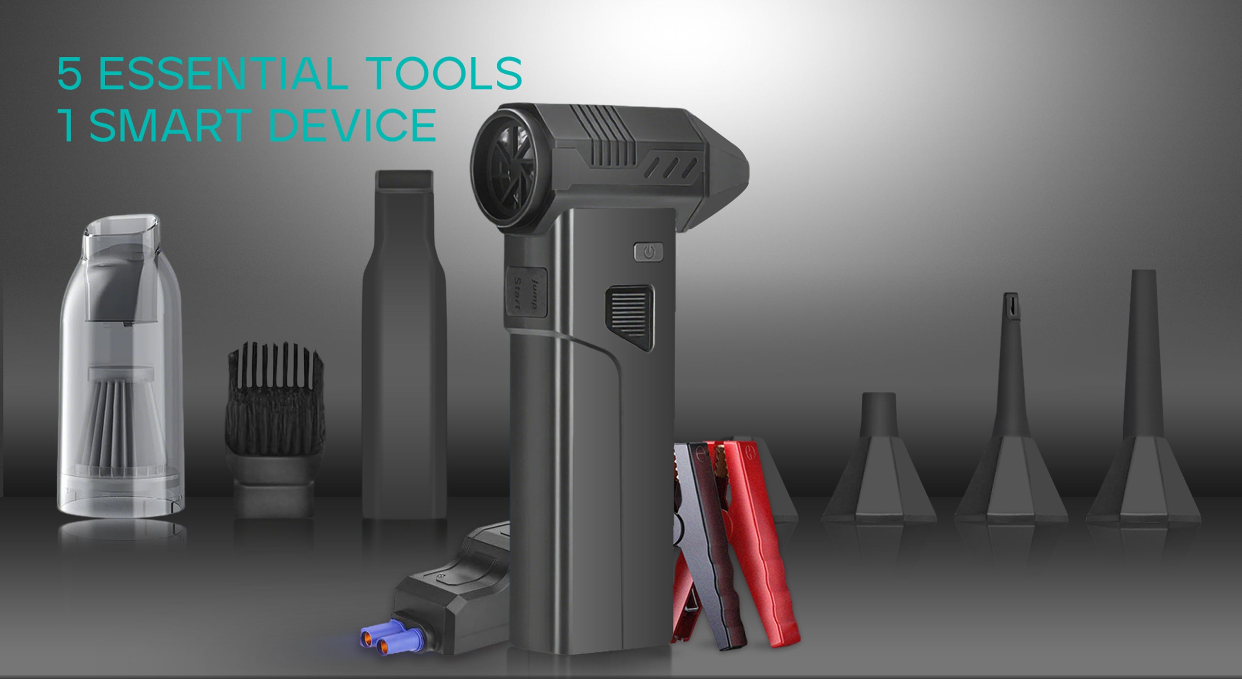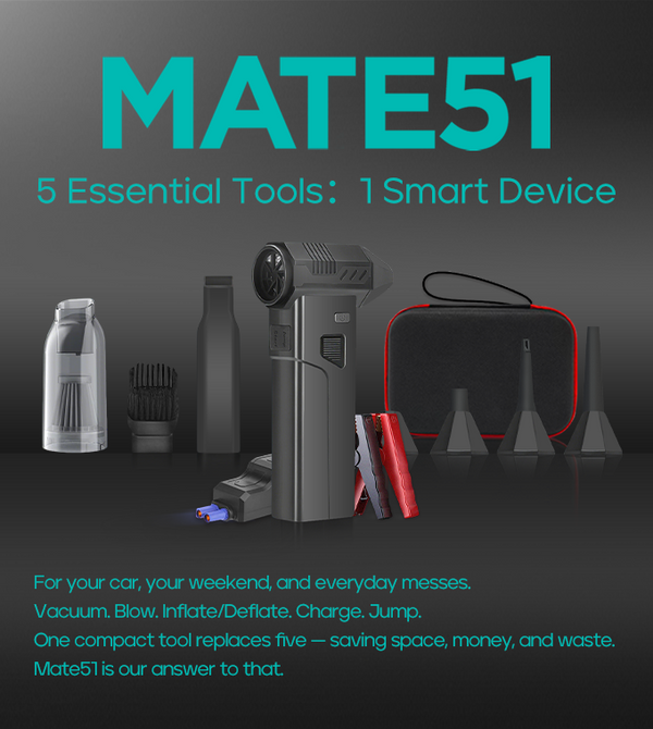 Using Mate51 is quick and simple. Attach your chosen tool, press the power button to start, and select your desired mode — Vacuum, Blow, Inflate/Deflate, Charge, or Jump-Start. One compact device, endless everyday solutions.