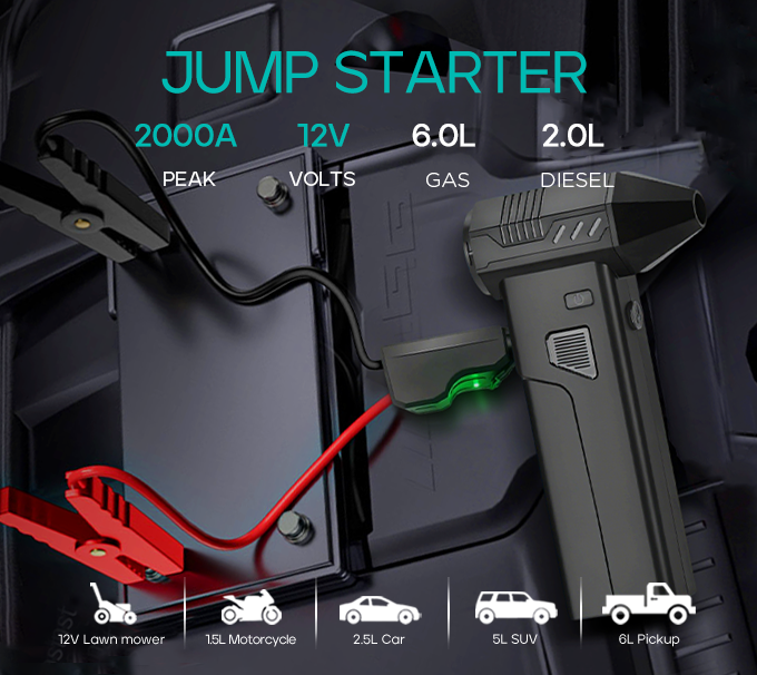 Instantly jump-starts cars with 2000A peak power, compatible with gas and diesel engines.