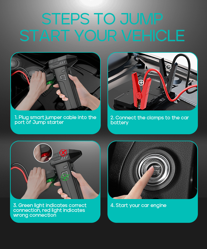 Jump-starting your car with Mate51 is fast, safe, and easy. Simply plug the smart jumper cable into the port, attach the clamps to your car battery, and check the indicator light — green means go, red means reconnect. Once connected correctly, start your engine and get back on the road in seconds.